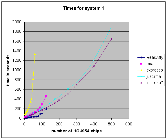 To fairly compare we also include times for reading data in using ReadAffy() in the times for rma() and expresso(). The read.affybatch2() function was used in place of read.affybatch(). This function is a little faster and has a lower memory overhead.