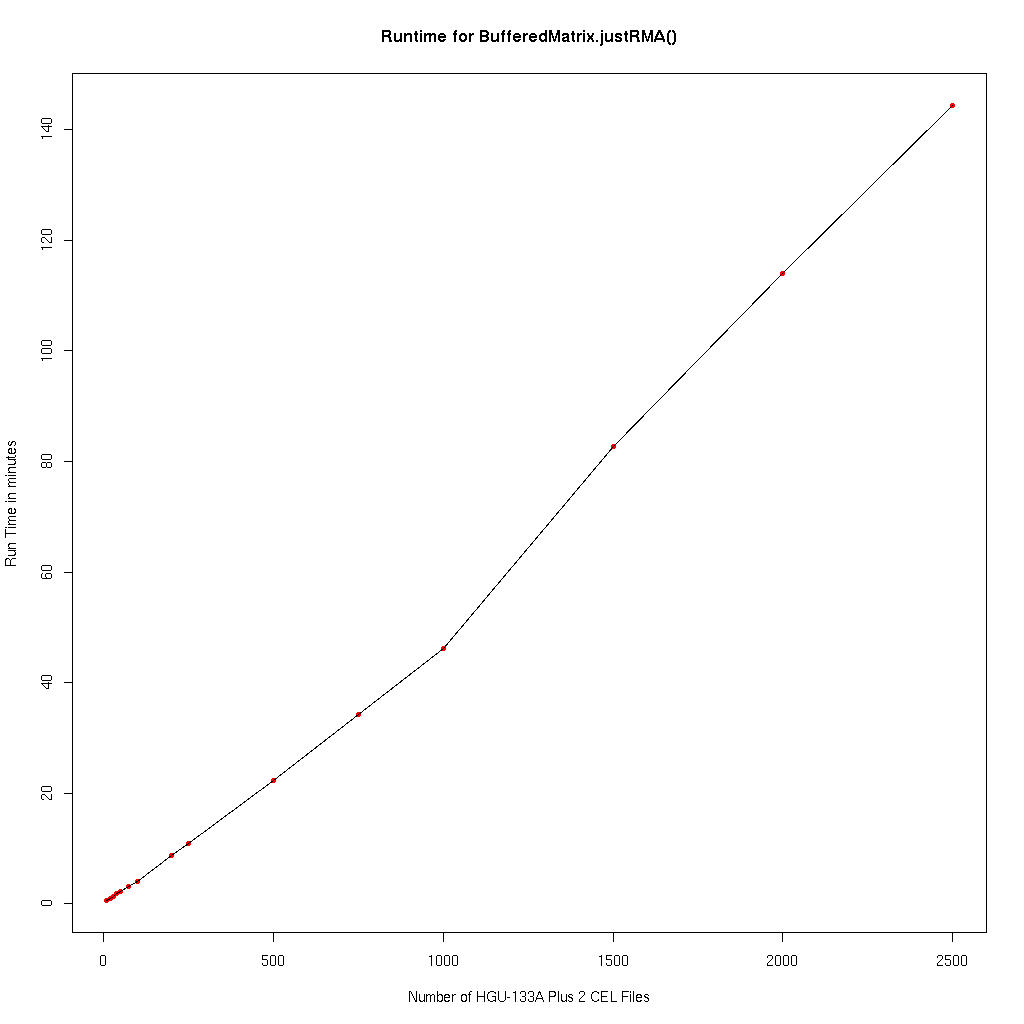 The goal here was to investigate the speed of BufferedMatrix.justRMA() as a function of the number of arrays processed between 10 and 2500 HGu-133 Plue 2.0 arrays