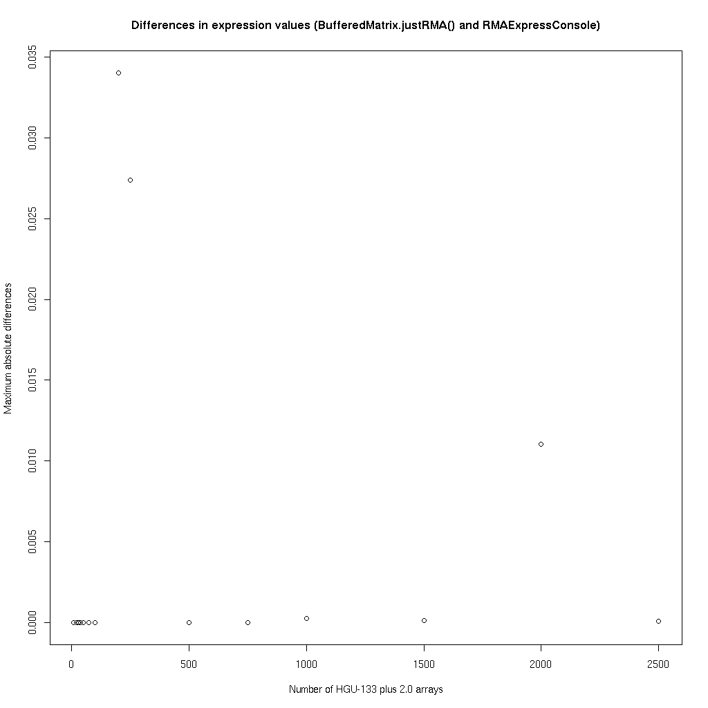 DiscussionThe runtime between the two was very consistent. There seems to be some inconsistencies in the expression values generated in some situations. Since RMAExpressConsole writes out expression values to 8 significant figures and using R we write to 16 decimal places we expect the maximum observed difference to be around 5*10^-7. In the case of 10-100 arrays this was true. However, for 200 and 250 there were more significant differences observed for expression values for all arrays. At 500 and 750 the differences were insignificant. Larger differences were also observed for the 2000 array set. Note that because the differences are fairly consistent between arrays within a dataset, it is not expected that the differences between the the two implementations would have any significant effects on any down stream analysis. |